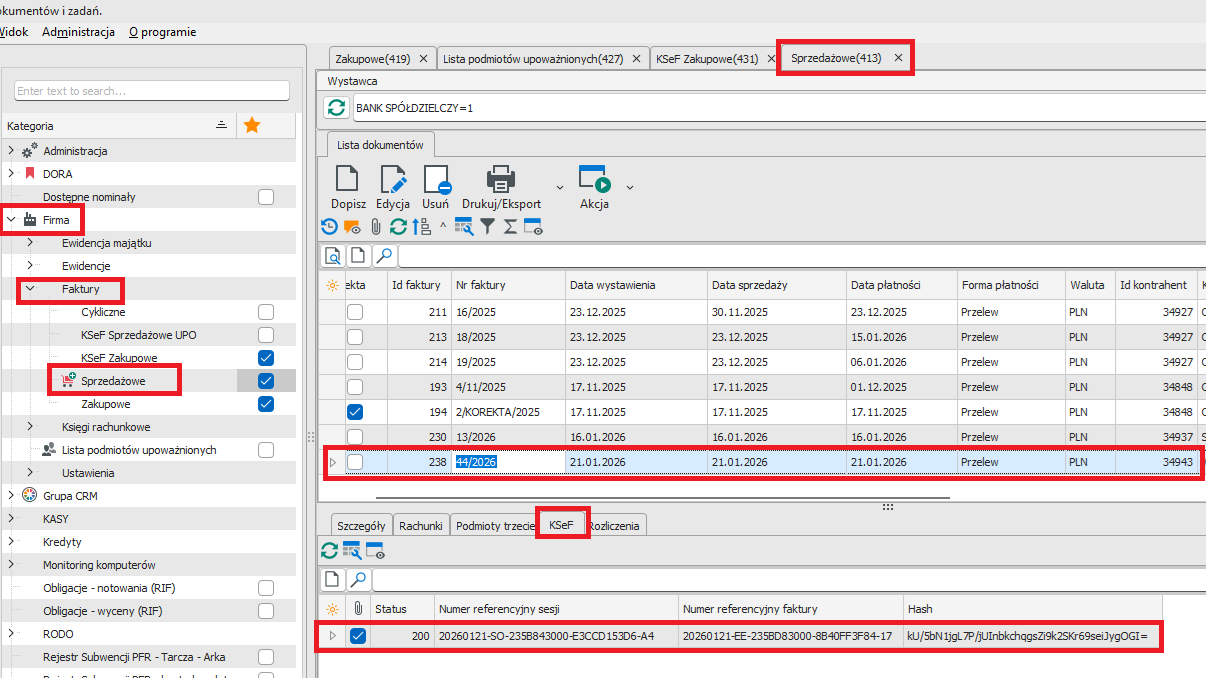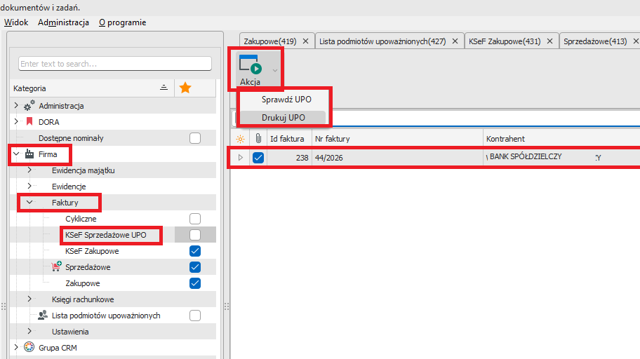 KSeF Sprzedażowe UPO : Firma → Faktury → KSeF Sprzedażowe UPO (rys.8). W rejestrze prowadzona jest ewidencja UPO dla faktur wysłanych do KSeF z możliwością wydruku (rys.1).