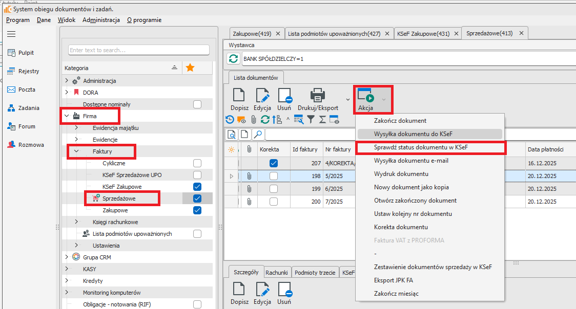 Sprawdzenie statusu KSeF : Akcja → Sprawdz status dokumentu w KSeF (rys.4). Po weryfikacji dokumentu w KSeF w przeglądarce zostanie wyświetlony wynik sprawdzenia. Status 200 oznacza poprawnie przetworzony dokument.