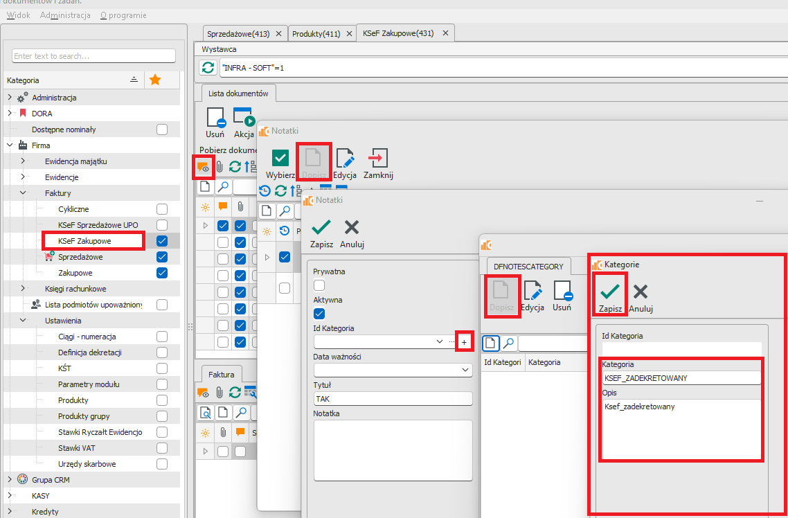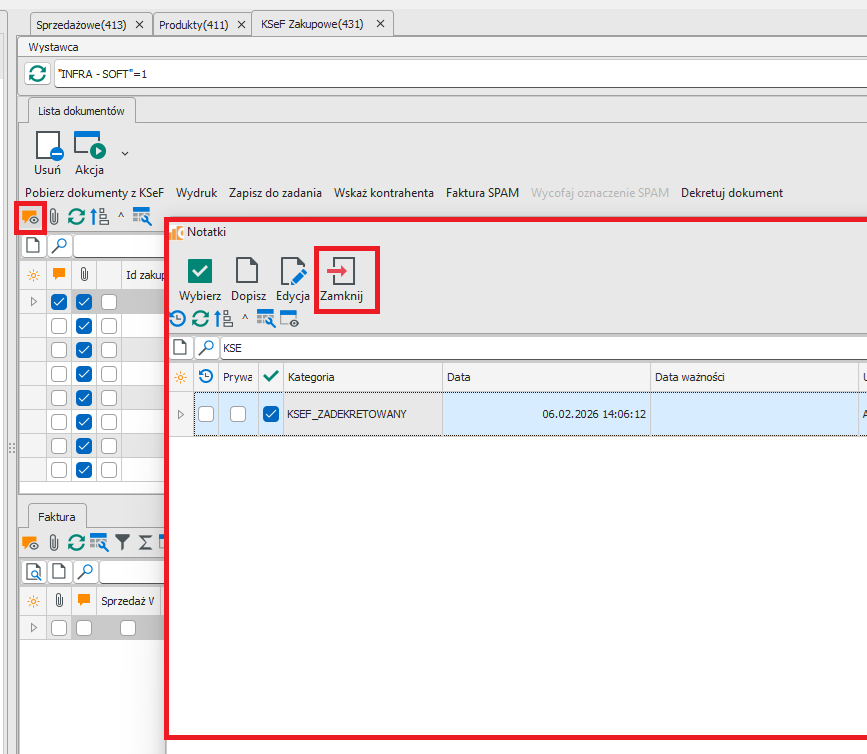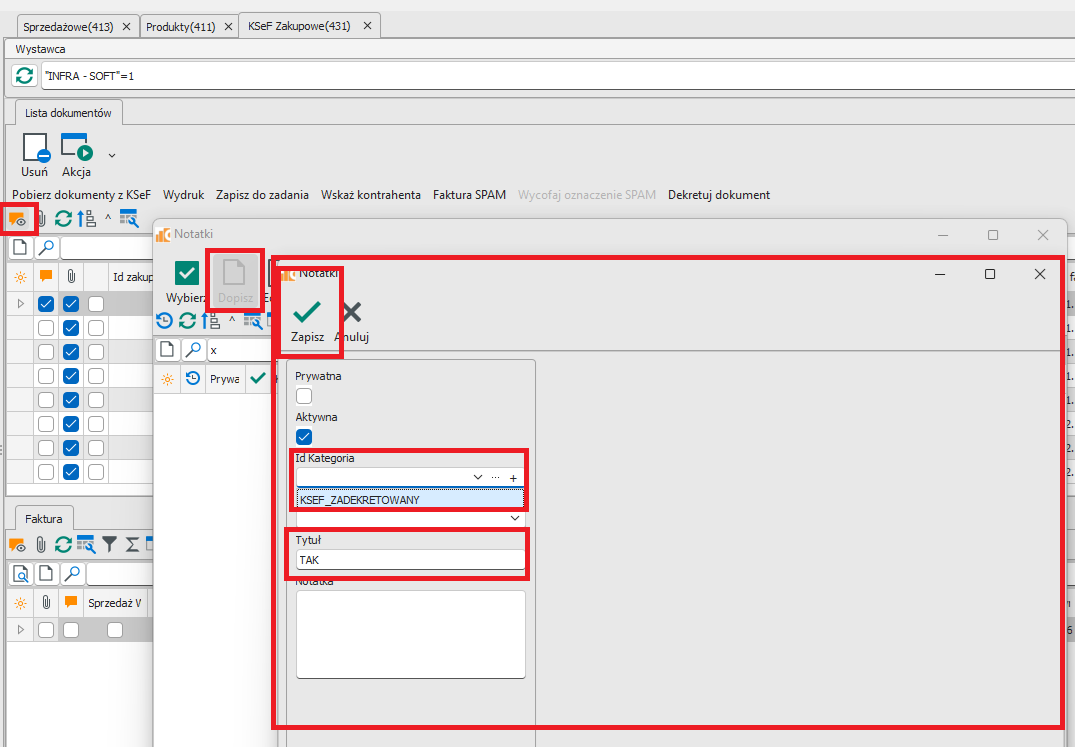Notatkę wprowadzamy w KSEF Zakupowe. Ustawiamy się na wskazanej fakturze, dopisujemy notatkę (rys.10). Wybieramy wprowadzoną kategorię z listy, oraz wpisujemy w polu Tytuł : TAK. W polu Notatka wpisujemy dodatkowe informacje. Całość zapisujemy. Po zapisie program cofa się do listy notatek (rys.11).