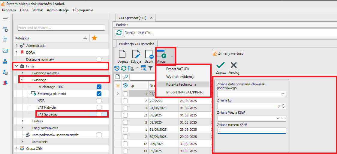 Korekta techniczna faktur wysłanych do KSeF : Faktury zamknięte i wysłane do KSeF znajdują się w Ewidencji VAT Sprzedaż. Zgodnie z datą zamknięcia przypisane są do odpowiedniego miesiąca rozliczenia VAT. Mają także określony Węzeł KSeF. Do korekty tych informacji przewidziana został opcja : VAT Sprzedaż -> Akcja -> Korekta techniczna (rys.6).