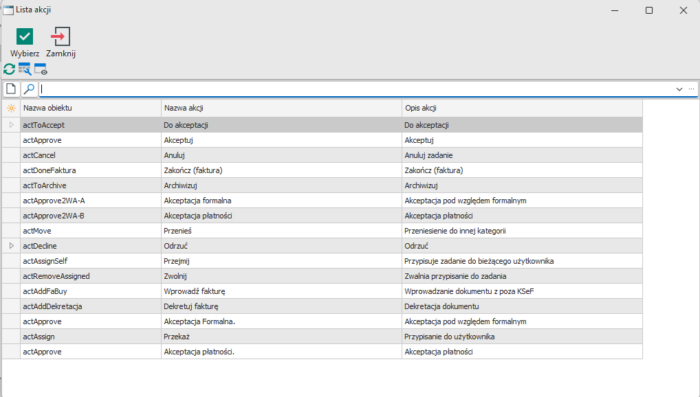 Akceptacja Formalna. (actApprove) i Akceptacja płatności. (actApprove) występują jako osobne akcje, które w scenariuszu obiegu są w osobnym krokach, nawet nie następujących po sobie. Co istotne mogą dodatkowo być pomiędzy nimi akcje typu Przekaż, Dekretu fakturę itp.